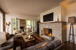 This home blends warm Craftsman architecture with rich natural materials, creating an inviting and timeless presence. Inside, deep green cabinetry, brass accents, and walnut details give the kitchen a refined, heritage-inspired character. The vaulted three-season room and its river-stone fireplace bring a cozy lodge feel with seamless indoor-outdoor connection. Throughout the home, thoughtful stonework, curated textures, and calm, earthy tones create a sense of comfort, quality, and understated luxury.